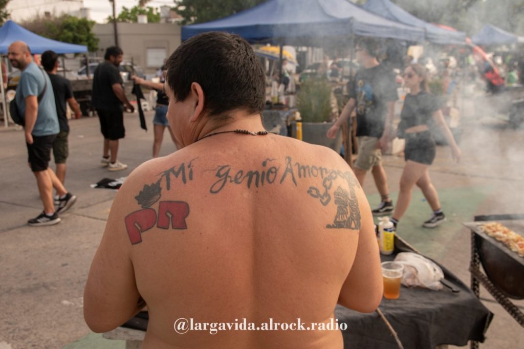 Aproveché para hacer unas fotos por 32 al mural que hizo el Javi Quintana con el dibujo de Serafín y a los trapos de todos los puntos del país: Jujuy, Ushuaia, Mendoza, Misiones, Casilda, Perga, Lago Puelo, La Pampa, Bahía y mucho conurbano bonaerense. Rock, humo, risas, abrazos, remeras agitando cada tema que sonaba de casi todos los discos de redondos y fundamentalistas. El movimiento cultural más importante, popular y federal de los últimos tiempos, donde la única forma de transmitirlo es vivirlo. Y eso sigue sucediendo: muchas familias, muchas infancias presentes, todos vestidos “para la ocasión”.
