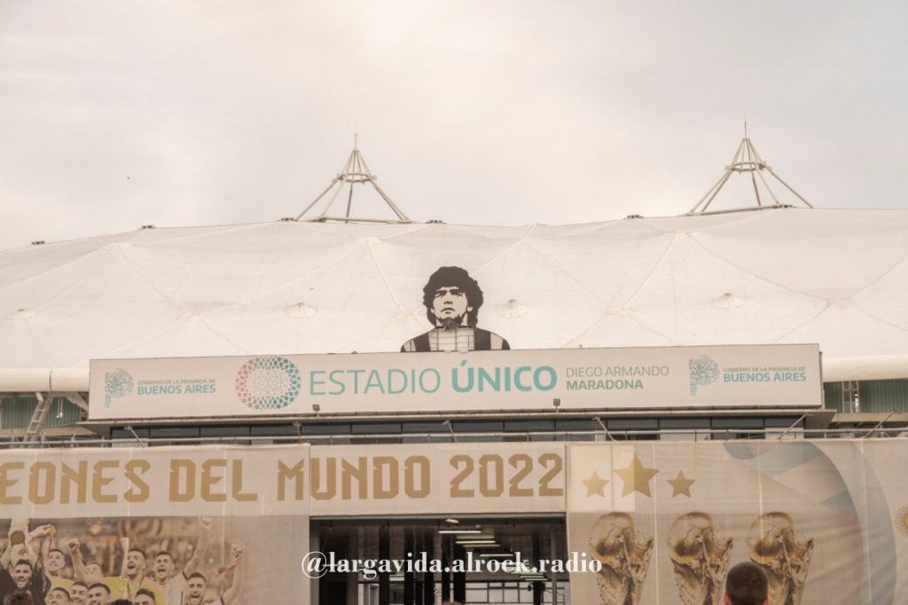 El Diego nos recibe al ingreso del estadio, nos bendice para que disfrutemos de los placeres que nos quedan, sin dañar. Me asomo desde lo alto de la platea B para observar el escenario… piel de poio y taquicardia. Ya estamos. Aparece el Gustavo luego de haber fracaso con todo éxito en su intento de cambiar el ingreso a la platea por un campo, y nos sentamos a disfrutar de ver y estar ahí. Mi amigo uruguayo me saluda desde el campo y nos recordamos que queda pendiente el compartir charlas y bebidas para un próximo encuentro. Cerca de las 20.30 me voy al punto de reunión de la secta de les fotógrafes con Nacho, quien está al frente del manejo de la prensa de la banda, gran persona con la que estoy en deuda que prometo saldar en la próxima. Me siento a charlar un rato con el Toto Ciccone sobre la fiesta sudaka del miércoles (que no pude ir) y de la muy buena versión que hizo Duratierra de Puño y Letra. Un abrazo con la Valen y el Agus, que cargaban una emoción terrible, y comenzamos a caminar hacia el escenario por el anillo superior a las plateas y la cabecera.