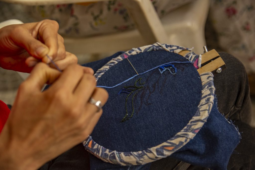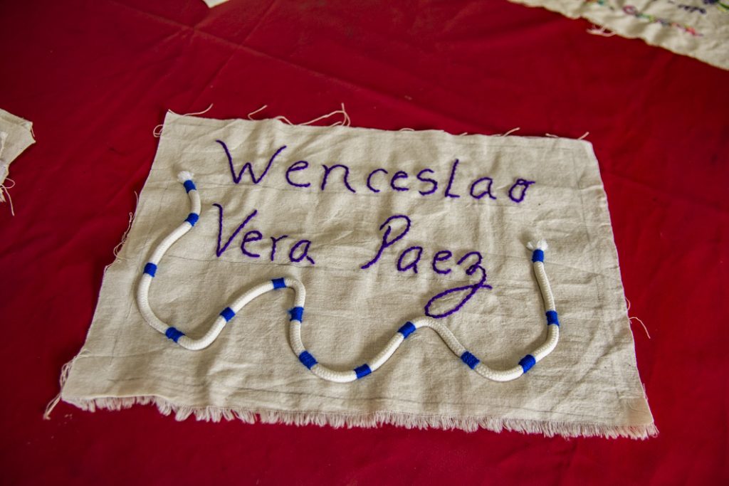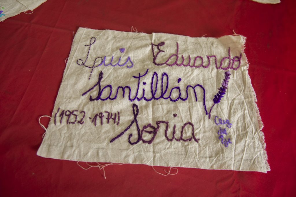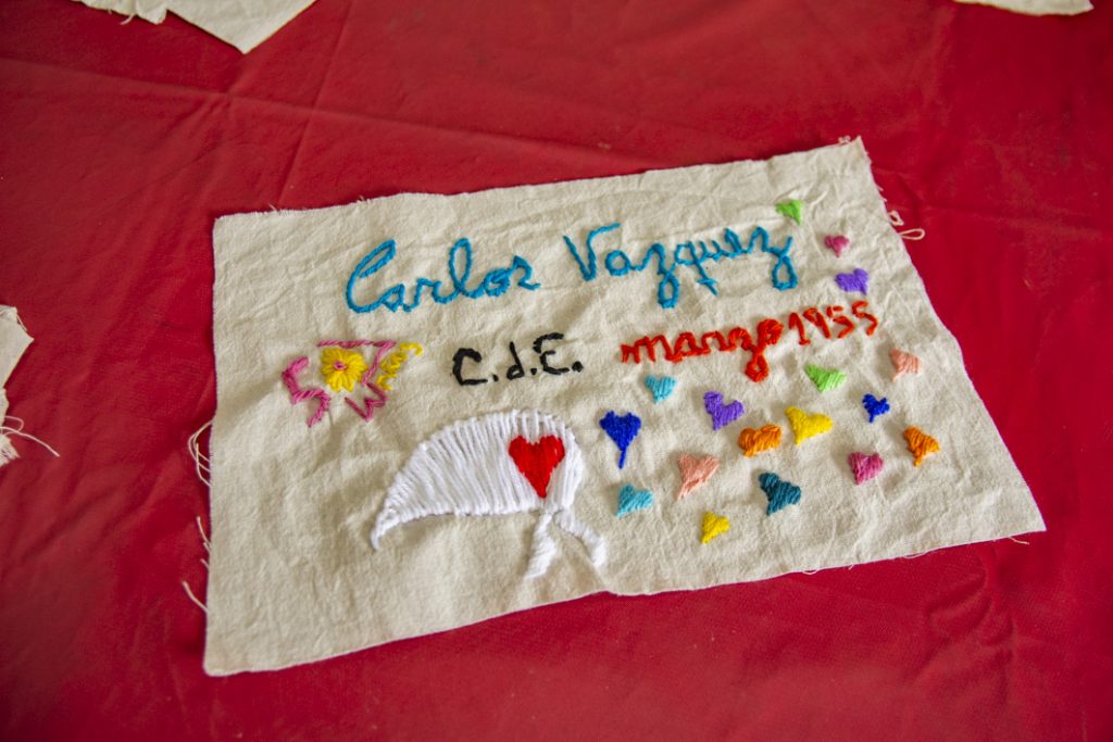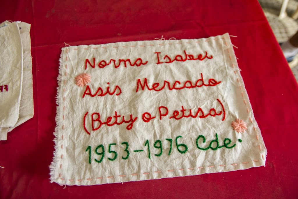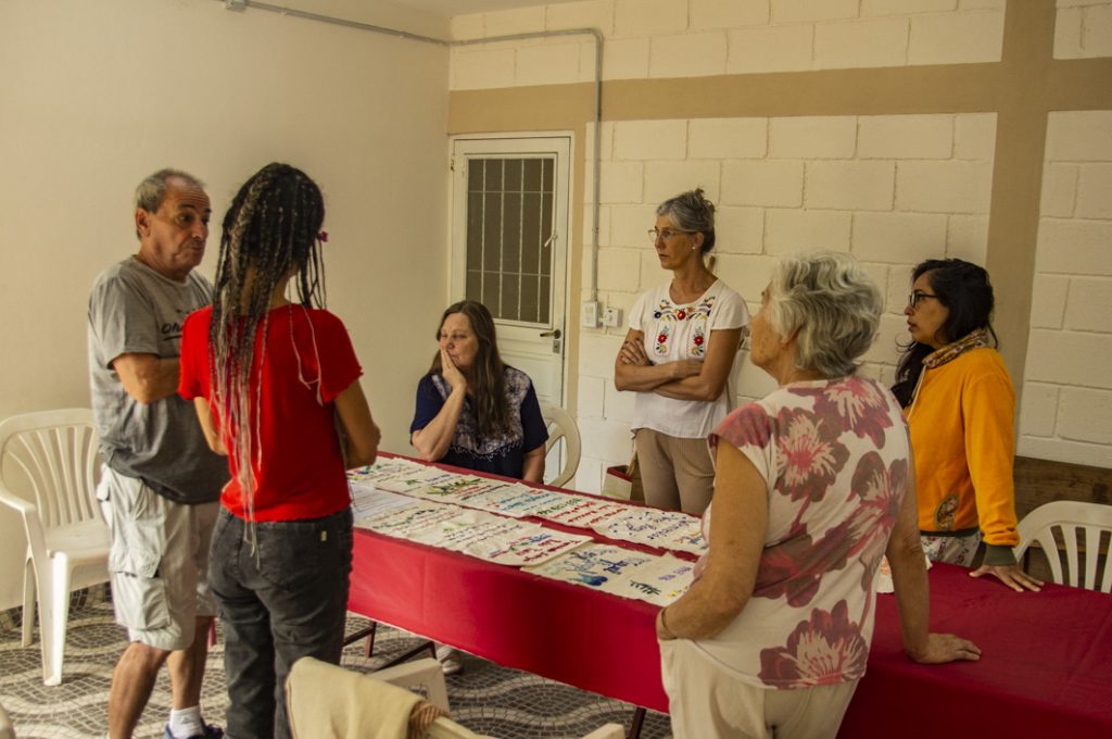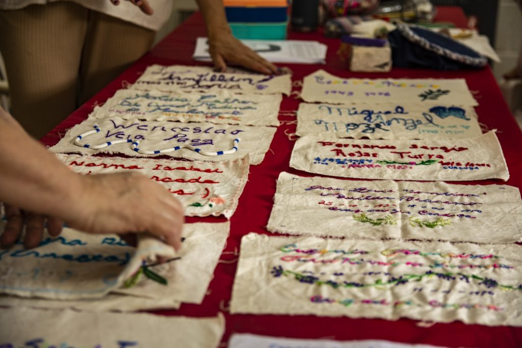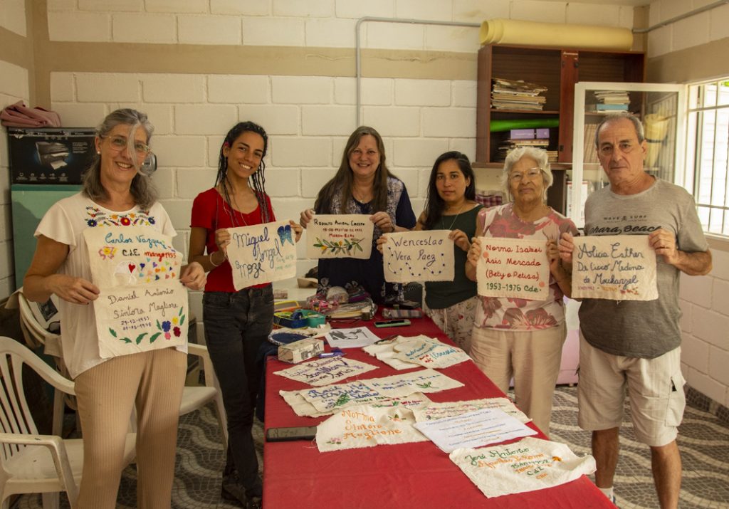 Dicha invitación fue socializada en nuestra zona por Leda Berlusconi y la acercó a un taller de bordadoras de San Marcos Sierras. La coordinadora y responsable del taller, Carina Vignolo, nos cuenta que: “fuimos invitadas en noviembre de 2025 por Leda para participar de una convocatoria y del mismo grupo sale la propuesta de bordar los nombres de los desaparecidos de la vecina ciudad de Cruz del Eje. Pedimos la info y nos ponemos a trabajar. Nosotras nos reunimos los martes por la mañana y, entre charlas y mates, las experiencias van fluyendo. A cada una nos interpeló desde lo vivido, en un grupo donde las edades de las participantes van de los 30 a los 70 años. El resultado fue conmovedor y enriquecedor.”