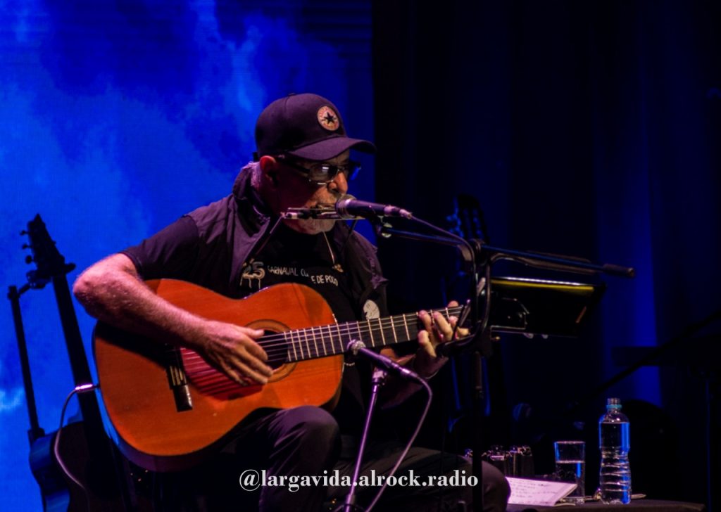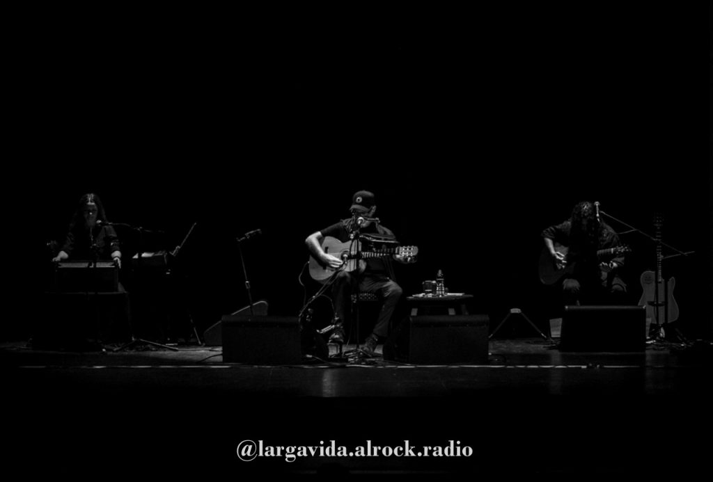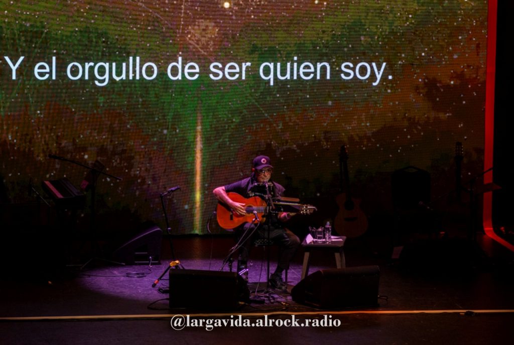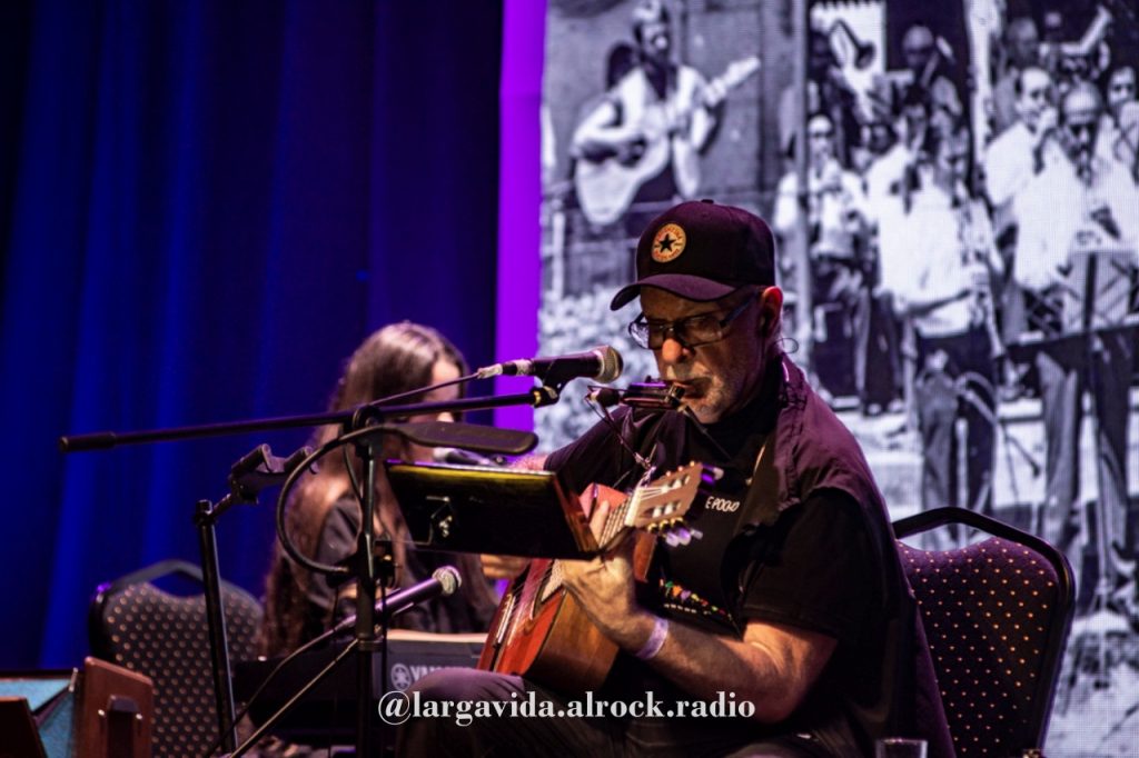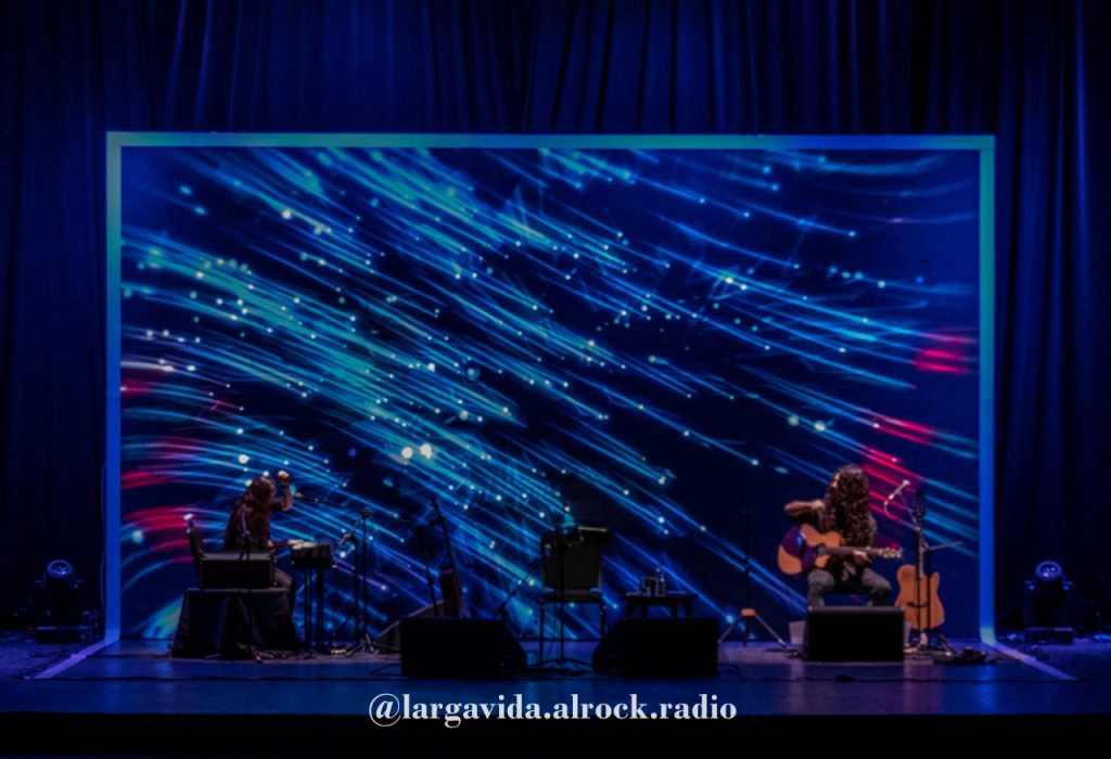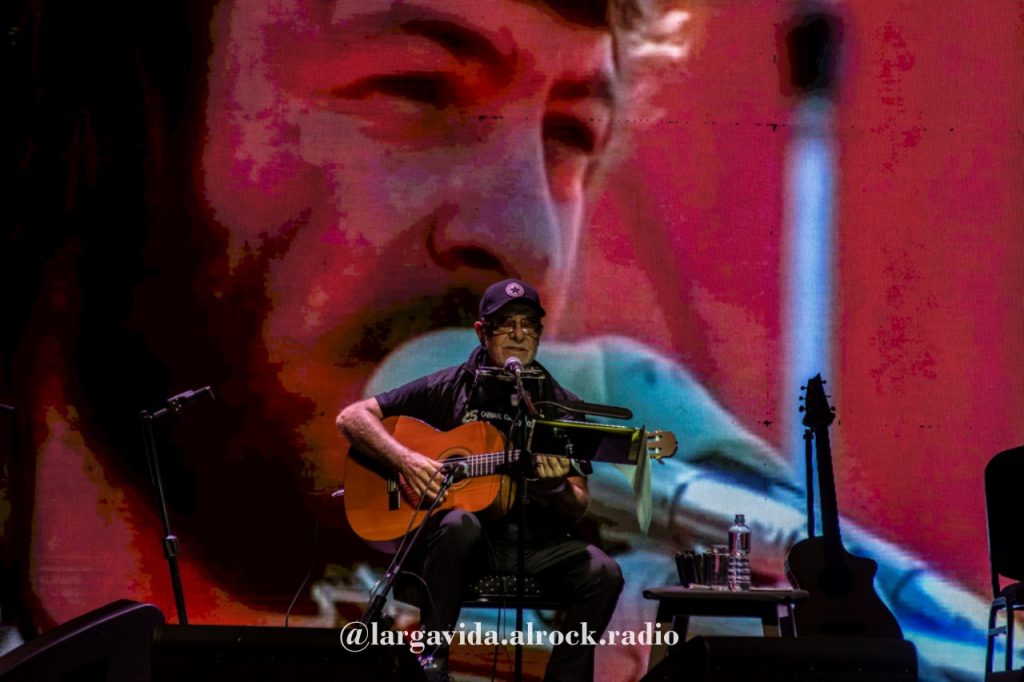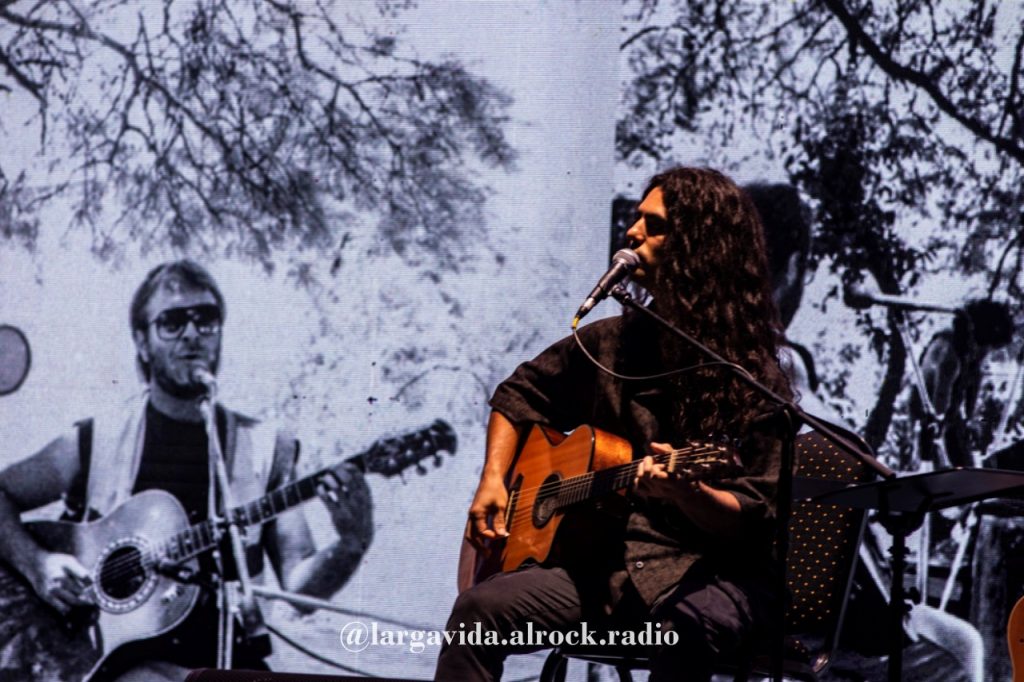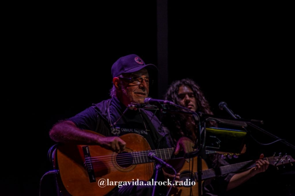 Silencio. León ingresa y no puedo contener las primeras lágrimas, que trato de secarme rápido porque no veo un carajo para hacer fotos. Estoy feliz, estoy nervioso, estoy viendo y haciendo fotos a León, estoy vivo y sonrío mientras en su guitarra nacen los primeros acordes: Hombres de hierro. Luego comienza a agradecer y nos cuenta sobre su último disco y lo que viene haciendo en los últimos años. Y nos vuelve a cantar: Días peligrosos, Las ausencias, El orgullo, Ojo con los Orozcos. Nos presenta el Espacio “León Gieco” en su Cañada Rosquín, y nos comparte fotos de su camino musical mientras canta: Cachito campeón de Corrientes, Canción para Carito, En el país de la libertad, La cultura es la sonrisa, El fantasma de Canterville y La memoria. Hay un ambiente muy cálido cuando hace la presentación de Joana y Alejo, que hace un tiempo que los quería ver en vivo y no podía organizarme para viajar a escucharlos. Tremendos artistas que hacen jugar y dialogar al piano y la guitarra, creando melodías que son… ufff…: Epicrisis, Converso, Portal, Pianístico, Prisa y Aura. Las visuales te llevan a un viaje psicodélico cri-mi-nal, el disfrute de la escena te atraviesa por todo el cuerpo. Vuelve a aparecer León para sumarse al dúo “Gieco – León”, cumpliendo un sueño que pocos pueden disfrutar, el de compartir escenario con la familia. Las melodías nos llevan de viaje nuevamente: Canción de amor para Francisca, La colina de la vida, Canto en la rama, Esos ojos negros, Don Sixto Palavecino, Las hojas tienen mudanza y Pensar en nada. Sigo intentando hacer fotos mientras me seco las lágrimas y la transpiración, busco enfocar y me doy cuenta que en realidad no estoy enfocando con la cámara, enfoco con el corazón. Se despiden y regresa León solo: Cinco siglos igual, El desembarco y El ángel de la bicicleta. Llama a Joana y Alejo para una canción de despedida: Fife and drum, y cierran los tres con Los salieris de Charly. El auditorio de pie para agradecer, mientras saludan con “Hoy bailaré” proyectándose en la pantalla.