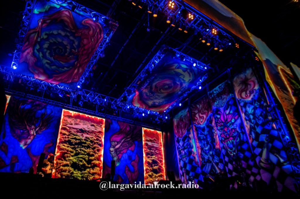 El caminar hasta la boletería para retirar las acreditaciones fue un anticipo de una gran noche: amistades, trapos y el arte del Javi Quintana y su tribu, dejando en claro que todo arte ES político. Luego de mucho transpirar en el ir por las acreditaciones e ingresar al predio, pudimos observar el tremendo trabajo que hay desde el arte visual para potenciar el banquete: desde la bienvenida hasta las banderas, las frases en diferentes sectores, una de las tablas con Bingo Fuel, el pulpo, las pantallas y los lienzos en el escenario. Ufff, cri-mi-nal. Y cuando comenzó el recital, las cámaras mostraron EL PISO del escenario!!!!!!